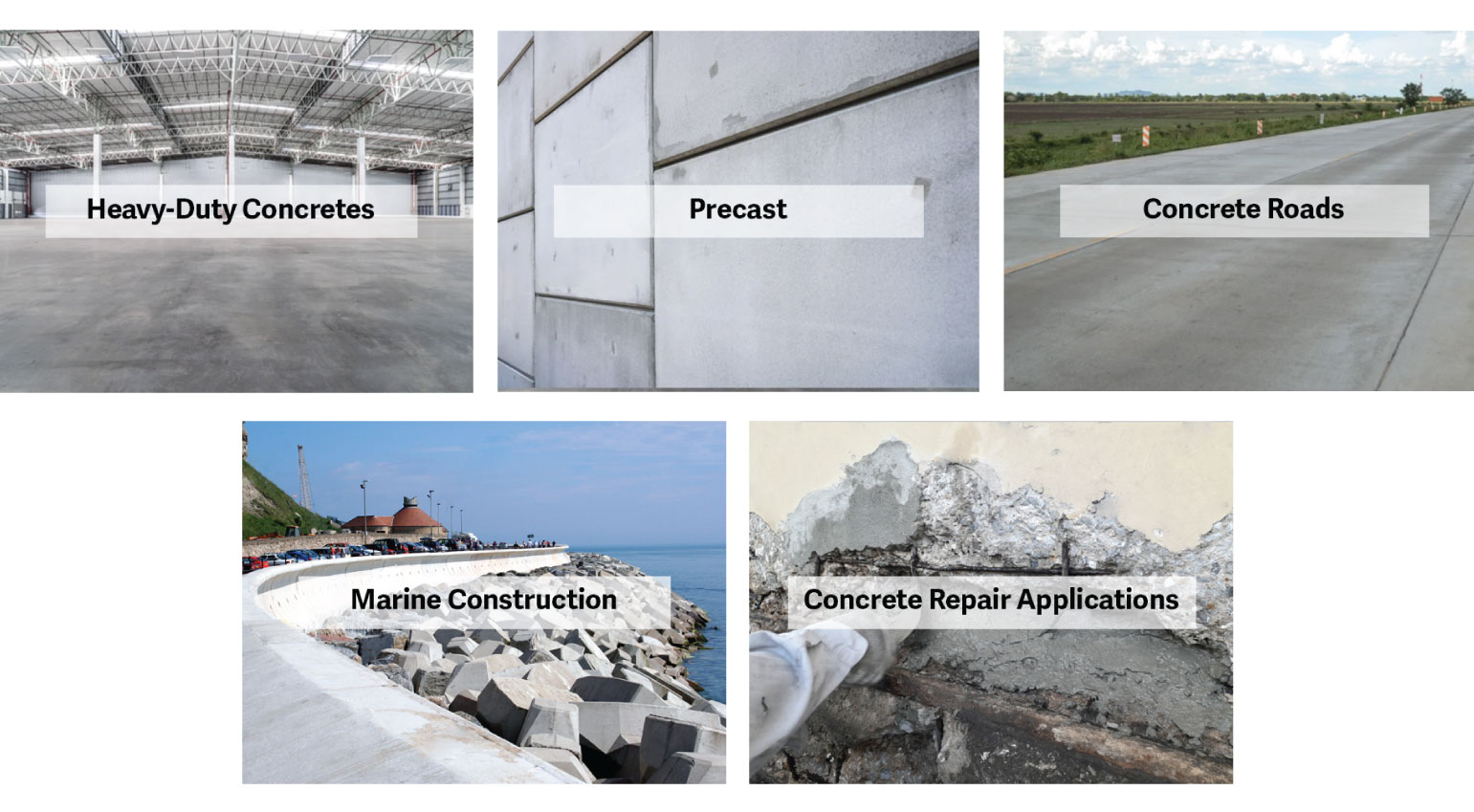 Heavy-Duty Concretes, Precast, Concrete Roads, Marine Construction, Concrete Repair Applications