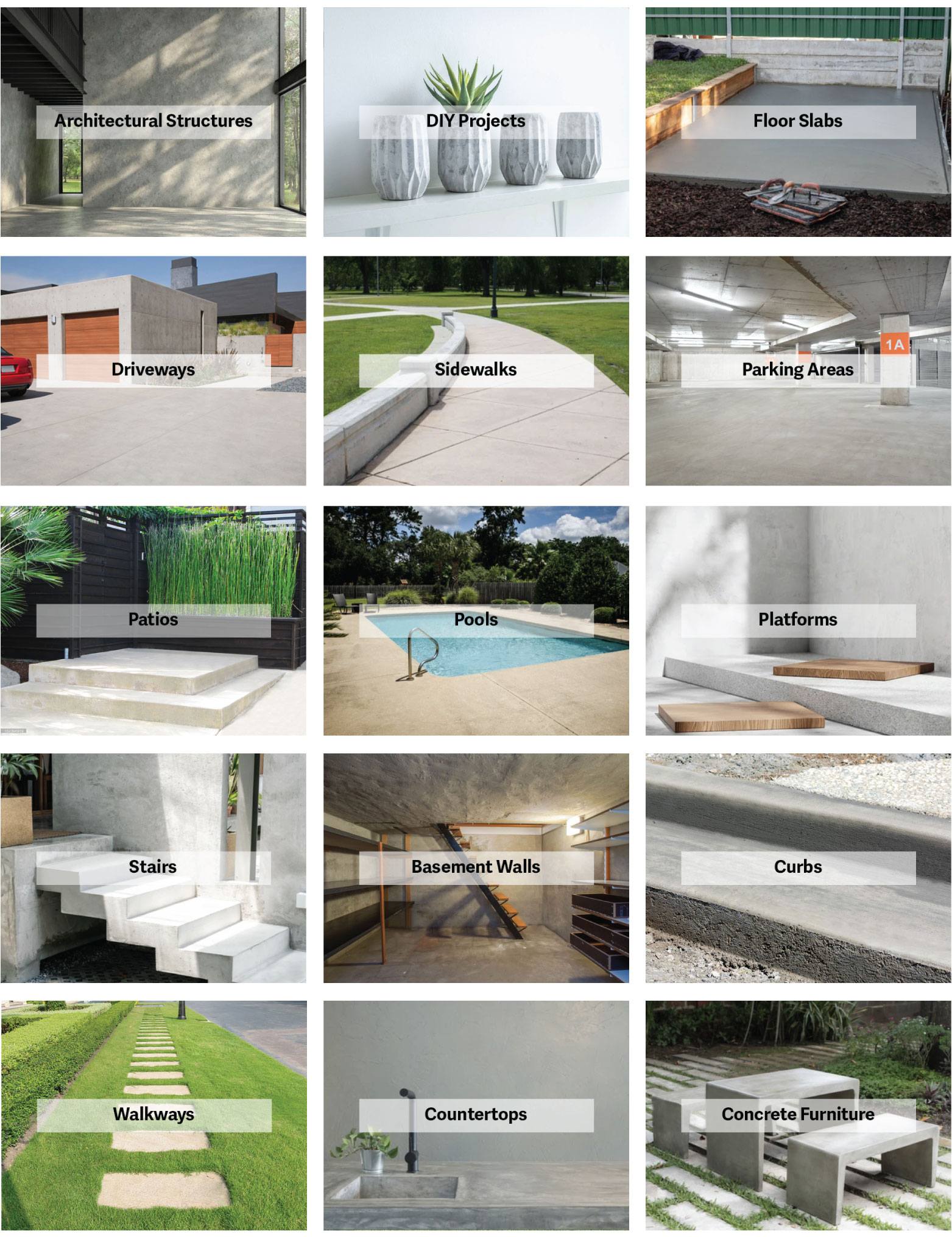 Architectural Structures, DIY Projects, Floor Slabs, Driveways, Sidewalks, Parking Areas, Patios, Pools, Platforms, Stairs, Basement Walls, Curbs, Walkways, Countertops, Concrete Furniture.